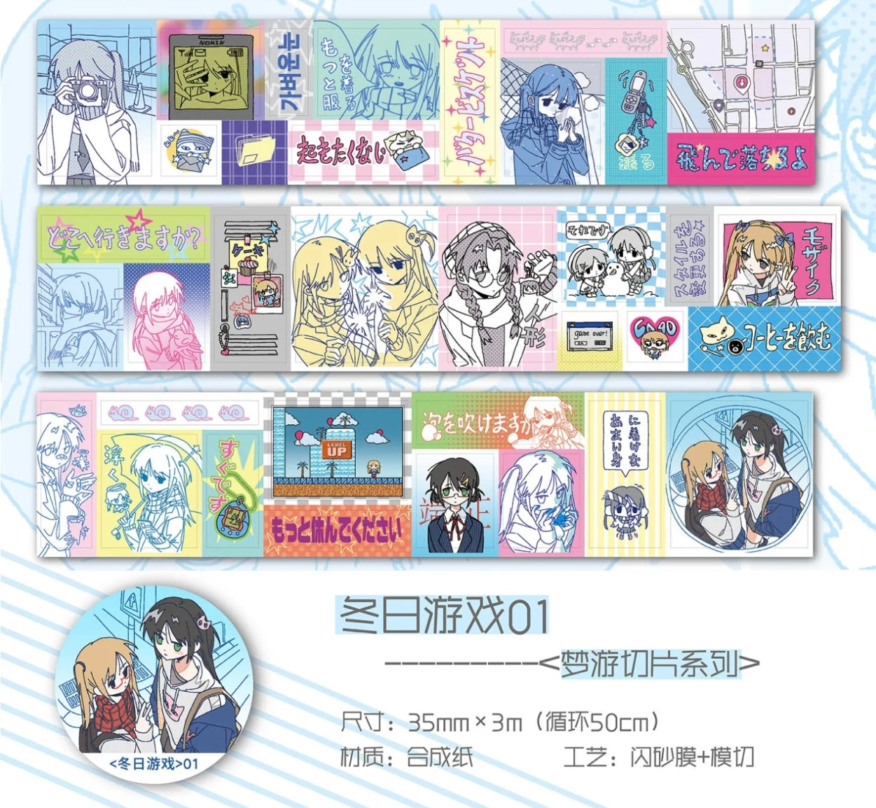 Sleepwalking Slice Die-Cut PET Glitter Sticker Roll ,Cute Dreamcore Girl Graffiti for Scrapbook DIY Decoration